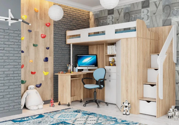 Благодаря универсальной сборке и универсальному углу, эту кровать-чердак можно легко адаптировать под планировку комнаты. Значит, даже в небольшой комнате она будет смотреться уместно и не займёт слишком много места, оставив пространство для игр или других активностей.